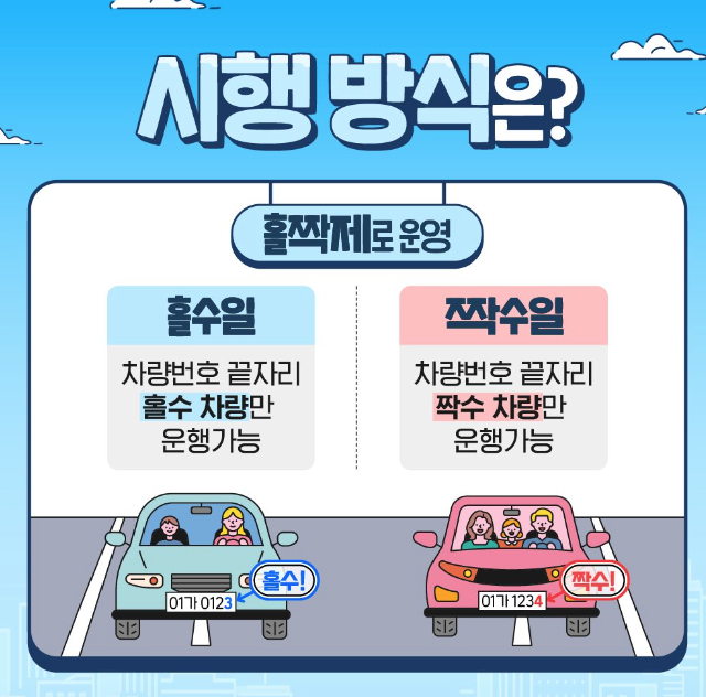 예를 들어 홀수 날짜에는 홀수 차량, 짝수 날짜에는 짝수 차량만 운행하는 방식입니다.