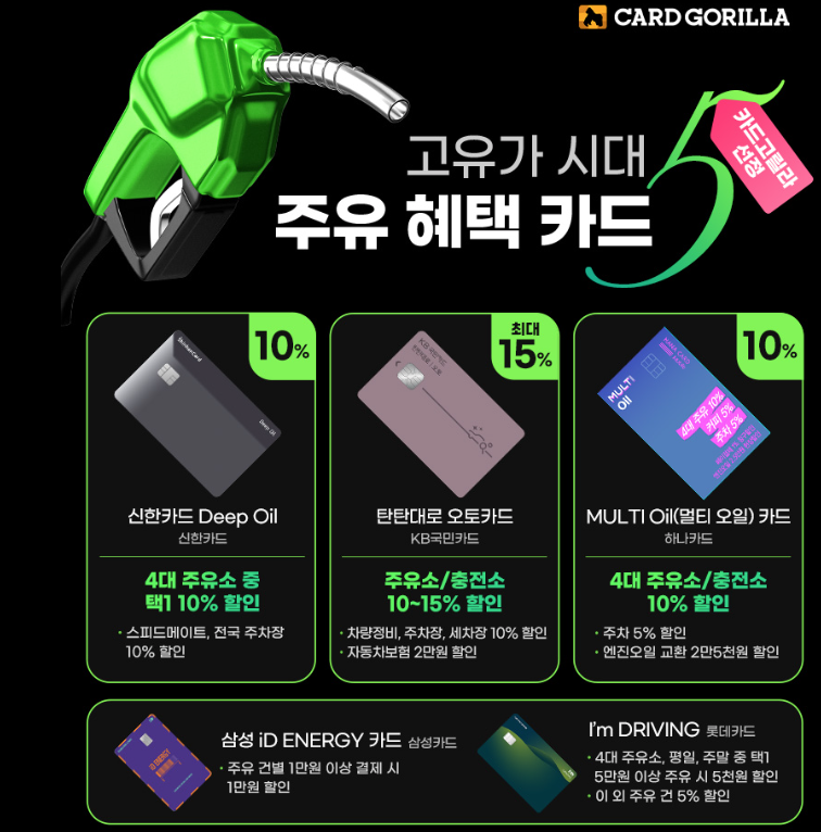 - 롯데·삼성·BC카드 → 5만원 이상 주유 시 5% 캐시백