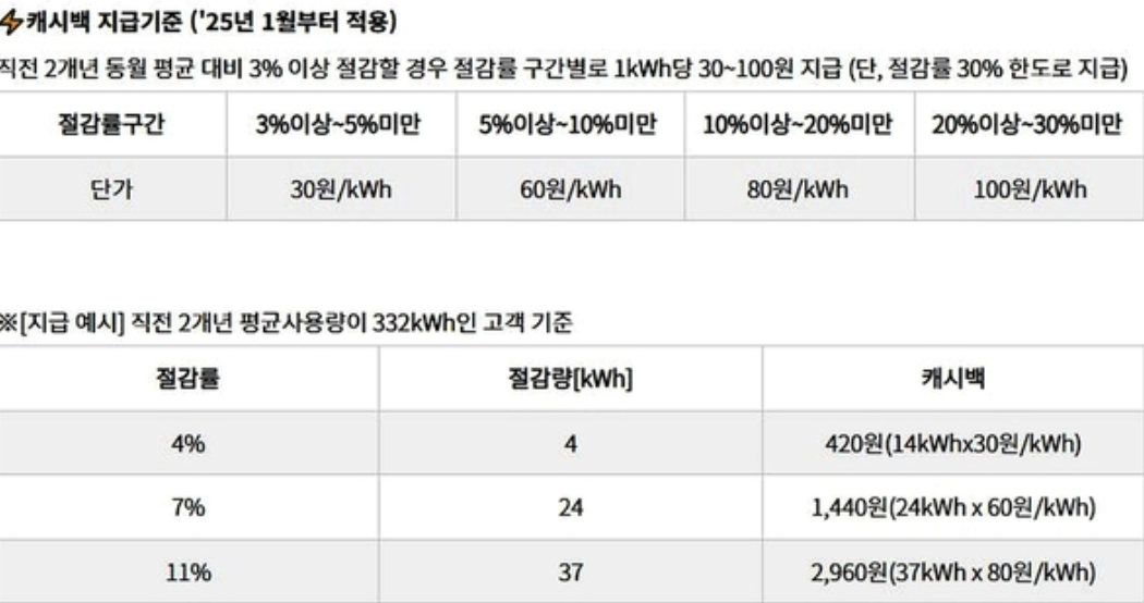 캐시백은 전기 사용량 절감률에 따라 지급됩니다.
